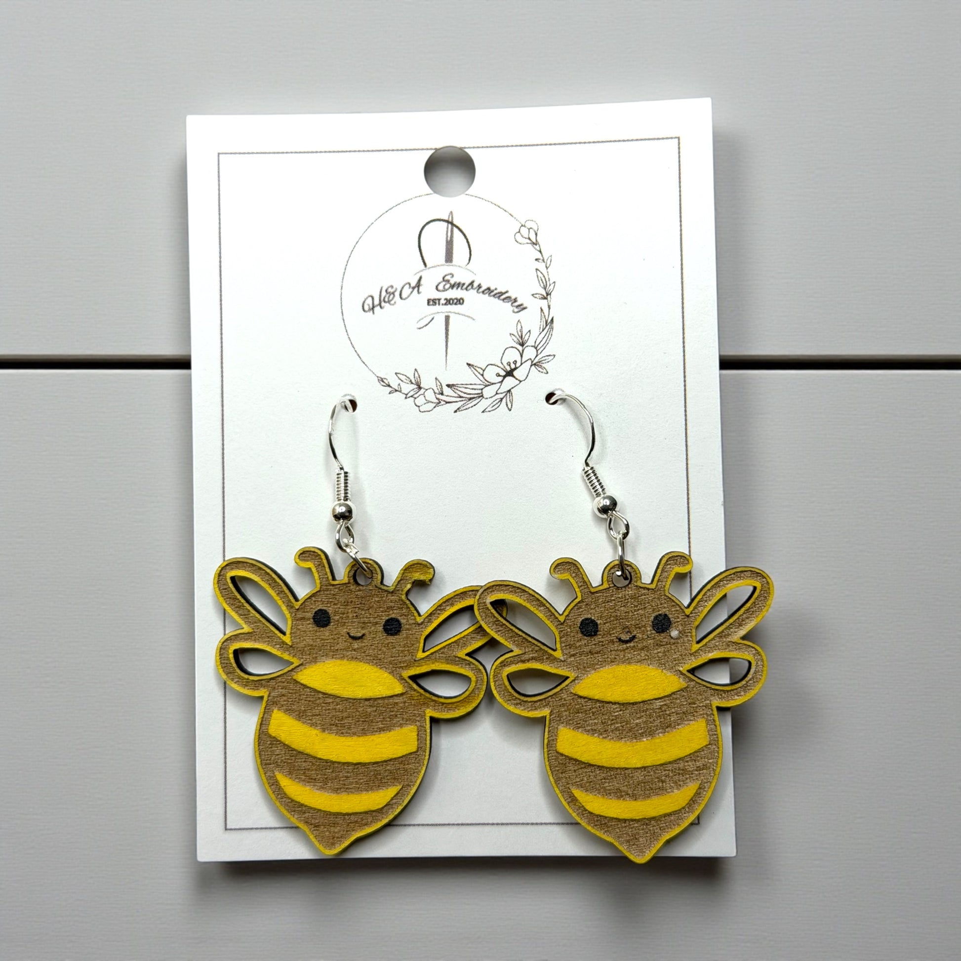 Expertly crafted from wood, these Bee Earrings are a stunning addition to your jewelry collection. Hand painted with high-quality acrylic paint, these earrings showcase intricate details and bring a touch of nature to any outfit. Enjoy the unique charm and quality of these earrings for years to come.